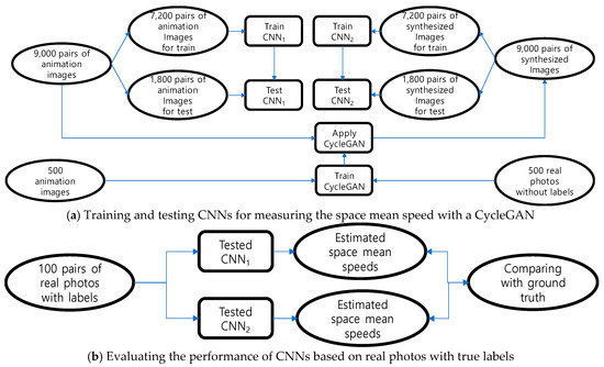 The first CNN model (=CNN1) for measuring the space mean speed was trained on 9000 pairs of cartoon-like naïve animation images with exact labels. A CycleGAN was trained using two unpaired datasets (=a set of 500 real photos and a set of 500 animation images), as shown in Figure 8a. The trained CycleGAN generated 9000 pairs of synthesized images from the 9000 pairs of animation images, which were then used to train and test the second CNN (=CNN2) to measure the space mean speed. After training and testing the two CNNs for measuring the space mean speed, 100 pairs of real photos with true labels were used to finally evaluate their performances (see Figure 8b).