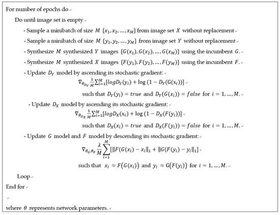 A SGD algorithm was also used to train a CycleGAN within the modeling framework suggested in Figure 8a. Generators and discriminators were updated alternately with the counterparts fixed at the incumbent models (see Figure 9). That is, images created by incumbent generators were used to update the discriminators, and then the generators were updated such that cycled images would closely approximate the original images. The mini-batch size M in the algorithm is a hyperparameter that should be chosen according to the computing capability. The hyperparameter was set as 3 within our computation environment.