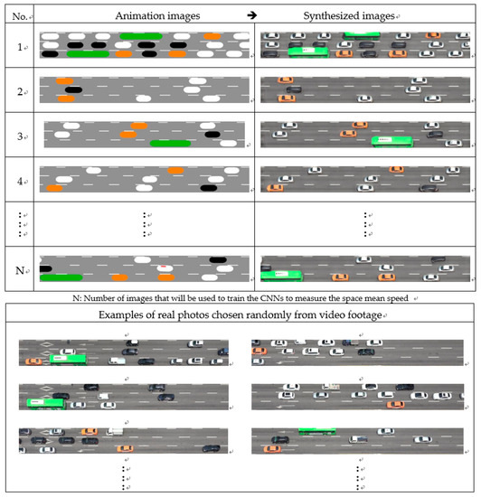 For supervised learning, facilitating the data acquisition process is as important as establishing the model architecture. It is well known that machine-learning performance depends more on the amount of training data than on what kinds of models are adopted [11]. In the present study, an approach to securing a large amount of labeled data without the need for labor-intensive human effort was devised. An actual road condition is mimicked by a reliable traffic simulator, and then animation images generated via the traffic simulator are used to train models. This approach offers great flexibility by securing an unlimited amount of pre-labeled data for measurement of the space mean speed. This scheme allows an analyst to produce labeled images for various traffic conditions. However, the so-called reality gap problem remains as to whether a CNN trained on cartoon-like naive images that are provided by a simulator can properly work for real photos [12,13].