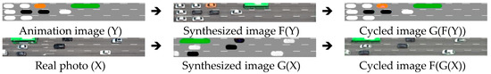 It is also possible for a trained CycleGAN to map real photos into animation images, but results of this conversion were not introduced since they have no utility in traffic surveillance. Figure 11 indicates examples to show how similar the cycled images are to the originals. Because one of the loss functions to be minimized was set as the discrepancy between the original and cycled images, it was not surprising that images after double mapping are very similar to the original input images.