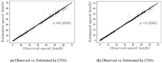 The basic loss of the two CNNs for measuring the space mean speed was identical to a general regression model. The discrepancy between the observed and the estimated space mean speeds was minimized. A stochastic gradient descent (SGD) algorithm was used to train the two CNNs for measuring the space mean speed. The SGD has been successfully applied to training deep learning models based on large-scale data. The algorithm saved considerable computation time, since it did not sweep the full batch of the dataset to compute a gradient of the loss function for an iteration. Instead, SGD updates the incumbent solution based only on a mini-batch, which is a small sample that is randomly selected from the entire training dataset without replacement. This sampling and updating procedure repeats until the training dataset is empty, which is referred to as an epoch. It is known that implementing multiple epochs ensures convergence to a local optimum. The recent successes gained with deep-learning models are among the results of this revolutionary algorithm. For details of the algorithm, readers are referred to Bottou [40].