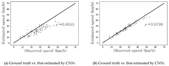 It is plausible that a CNN could be trained to measure the space mean speed based solely on two consecutive images on a road stretch. A human easily recognizes vehicle movements when consecutive images are overlapped with a fixed background. The present study was initiated by the notion that a CNN could mimic this human ability in an end-to-end manner. A CNN is expected to identify the pixel-by-pixel differences between the two images and to recognize the changes in vehicle positions. It is a rational assumption that the space mean speed could be estimated by scaling these changes. Many researchers have devised various engineering tools to measure vehicle speeds based on this assumption [28,29,30]. However, these engineering-based models were more complex and less transferable than an end-to-end learning model.