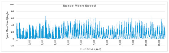 Using the CNN2 trained on synthesized images, a profile of the space mean speed was accomplished using the 4-h real video footage for the testbed (see Figure 14). The space mean speed was measured every 0.1 s from the video footage. To the best of our knowledge, such a speed profile had never been measured in real time. This continuous speed profile contains more information on traffic conditions than any other forms of traffic surveillance system could provide.