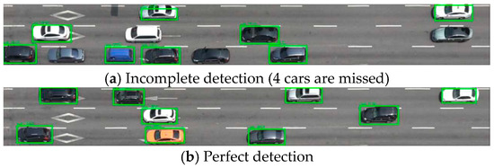 Three state-of-the-art computer vision technologies were mobilized to confirm that the performance of the proposed methodology is competitive. Besides these technologies, a CNN model trained on images drawn by a 3-D car model was also compared with the proposed methodology. The reference models were tested against the same dataset (=100 pairs of images with true labels) as used in the final validation. First, YOLO v3 was employed to measure the space mean speed for the dataset. Figure 15 shows a successful and a failed YOLO. The first image shows the YOLO is not error-free when the density of objects gets larger, as mentioned in the original paper [31].