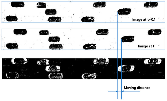 The second reference methodology was a background subtraction. Figure 16 shows how to measure moving distances of vehicles based on a background subtraction method. A background image and two pairs of photos taken in 0.1 s. intervals were prepared. The background image was obtained such that each cell of the image took the median value of the same cell values of all 4-h video shoots. The top two images in Figure 16 were obtained from the difference in cell values between two consecutive images. The threshold value to judge whether the difference originates from a vehicle’s presence was set as 17. A cell with a difference larger than this threshold value was assigned 0; otherwise, it was assigned 255. The bottom image was created by subtracting the top image from the middle image and reversing the subtracted image. To measure the moving distances of vehicles, white blobs were recognized and then their average horizontal lengths were measured and summed. The sum of the average lengths was then divided by 2, since each vehicle had two white blobs. The space mean speed was computed by dividing the sum of the distances by the vehicle count. Detecting white blobs also required engineering judgement.