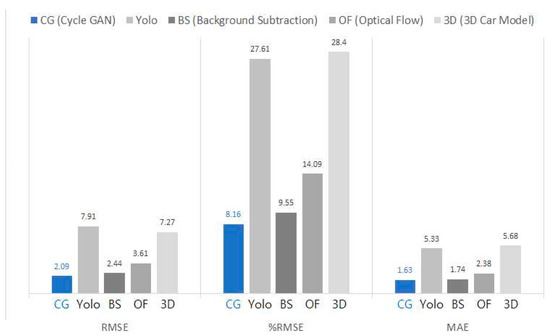 Figure 19 compares the measurement performances of five different methodologies. Unexpectedly, the model performance from the 3-D car model is the worst. This might be because a car drawn from the 3-D model is more realistic than a dot shapes but is still insufficient to catch up with a true car in real photos. Of course, if a more realistic car model is available, a more accurate result could be obtained. However, it would cost much more to obtain a more realistic 3-D car model than to apply a CycleGAN to synthesizing images.