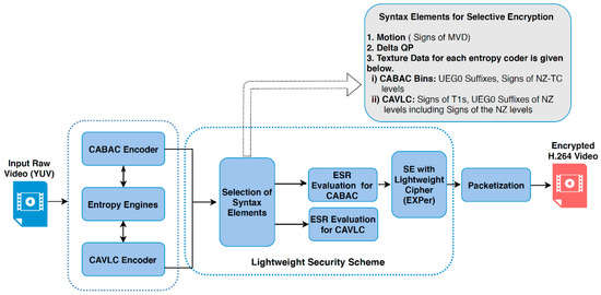 - Asghar, M.N.; Ghanbari, M.; Fleury, M.; Reed, M.J. Sufficient encryption based on entropy coding syntax elements of H.264/SVC. Multimed. Tools Appl. 2015, 74, 10215–10241. [Google Scholar] [CrossRef]