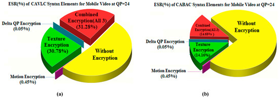 Furthermore, as previously mentioned it is also worth noticing that the ESR with delta QP is comparatively lower than the ESR of only motion or only texture parameters for all tested videos. Thus, the ESR of delta QP combined with motion (0.50% for mobile video and 0.14% for ICE video) or delta QP combined with texture (12.80% for mobile video and 4.15% for ICE video) is also less as compared to the encryption ratio with combined motion and texture (13.22% for mobile video and 4.21% for ICE video). The important point to note here is that the SE on the absolute values of dQP is not possible with complex cipher algorithms, because the number of rounds in complex ciphers makes these values out of range which destroys the format compliance and compression efficiency of the bitstream, and consequently crashes the decoder [52].