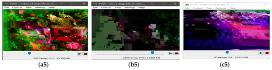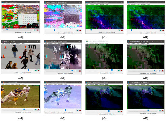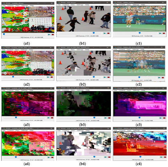 Visual protection of tested videos with EXPer encryption on selected syntax elements. (a1) Original mobile video; (b1) original ICE video; (c1) original STEFAN video; (a2–c2) SE on only Motion with EXPer; (a3–c3) SE on only texture with EXPer; (a4–c4) SE on only delta QP with EXPer; (a5–c5) SE on combined (motion, texture and delta QP) parameters with EXPer.