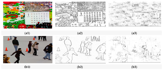 The comparative visual impact of EXPer on ICE and mobile video sequences after Laplacian edge detector. (a1) Plaintext mobile video frame; (a2) detected edges of plaintext mobile video frame; (a3) detected edges of encrypted mobile video frame; (b1) plaintext ICE video frame; (b2) detected edges of plaintext ICE video frame; (b3) detected edges of encrypted ICE video frame.