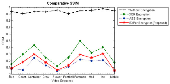 The visual results with the proposed encryption algorithm EXPer on CIF video sequences mobile, ICE and Stefan are presented in Figure 5, which imply that sufficient confidentiality is achieved without generating encryption overhead. The ESR with CABAC for ten videos is depicted in Table 4. The ESR of delta QP is only 0.04% while 0.34% and 6.92% with only motion and texture respectively for the ICE video. The ESR for all parameters for ICE video is 4.25% with the CABAC coder, which is 95.75% less than the data for naïve encryption. The average ESR for test videos with all parameters combined (i.e., motion, texture and delta QP) is 8.69% which is minimal and can be adopted by IoT devices.