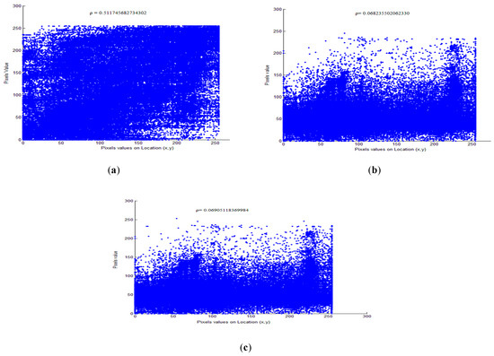 Comparative pixels correlation coefficient of plaintext and encrypted mobile video sequence. (a) XOR; (b) AES-CFB; (c) EXPer.