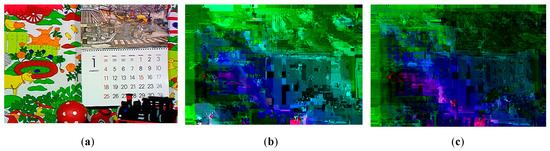 Key sensitivity analysis. (a) Original frame; (b) decrypted with K1; (c) decrypted with K2.