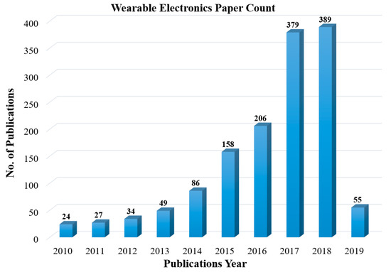 Number of publications per year with titles including wearable electronics (Source: NCBI (National Center for Biotechnology Information)).