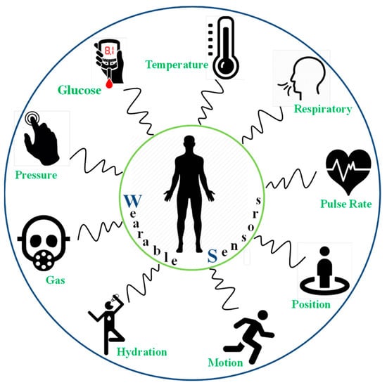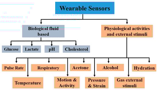 The development of sensors and electronics on unconventional, non-planar, conformable substrates through cost-effective manufacturing routes diversified the application areas [1,2,3,4]. The rapid emergence of a wide range of nanomaterials with enhanced sensitivities (compared to their bulk counterparts) and solution processability offered a promising outlook for these sensors to be developed and operated at room temperatures [5,6]. Among the latest developments, wearable sensors and electronics attracted significant interest for their capabilities to monitor human health status in real time [5,7,8,9,10]. Figure 1 shows the trend of publications in recent years targeting wearable electronics applications. A wide variety of chemical, physical, and optical sensors are embedded separately or combined onto flexible substrates with complementary data readout and signal conditioning circuits [11,12,13,14,15]. Data are transmitted wirelessly to nearby computing devices or in the cloud, and are examined by medical experts who give respective commands as per the health conditions [5,16,17]. Polymeric substrates are ideal for employing these sensing devices and circuits for their burgeoning properties such as their light weight, low cost, flexibility, bendability, foldability, stretchability, and conformability to uneven surfaces with negligible losses to the sensor data [18,19,20]. In the current scenario of the development of wearable electronics, biosensors related to in situ monitoring of human biological fluids, physiological activities, and gaseous analytes in the surrounding environment that directly affect human health are of particular interest [21,22,23,24]. A few representative examples are mentioned in the schematic of Figure 2. Developing wearable sensors for healthcare-related applications faces a multitude of challenges, including the selection of suitable substrates, biocompatible materials, and manufacturing techniques, as well as the simultaneous monitoring of different analytes, the washability, uninterrupted signal readout circuits, etc. The recent developments of all-organic biocompatible or hybrid sensors on wearable substrates are paving the way to realizing body-worn sensing systems for in vivo monitoring.