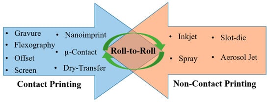 Printing is a rapidly growing field for the fabrication of sensors and electronics on non-planar substrates. It involves position-specific deposition of functional materials from their colloidal or chemical solutions. The number of fabrication steps is far less than that for standard microfabrication technology practiced in clean-room processes [26,27,31]. Printing is a bottom-up manufacturing approach, whereby materials are added layer by layer in succeeding fabrication steps. This additive manufacturing makes printing a distinguished process for its simple and cost-efficient approach compared to conventional microfabrication techniques. Printing techniques are broadly divided into two categories (Figure 4) based on contact and non-contact of the printing medium with the target substrates [26]. In the contact-based approach, the printing medium with designed structures on the surface is inked and brought in physical contact with the target substrate. Such techniques involve screen printing, gravure printing, flexographic printing, pad-printing, stamp-assisted transfer printing, etc. [26,47]. Details of these processes are provided elsewhere [26]. In non-contact-based printing, materials are ejected in the form of micro-droplets or a continuous jet, facilitated by miniaturized printing nozzle heads. This is often referred to as digital manufacturing, where droplets/jets are ejected on demand as a result of the respective actuation mechanism [29]. Non-contact printing processes predominantly include piezoelectric inkjet printing, electrohydrodynamic (EHD) inkjet printing, slot-die and aerosol-jet printing, etc. [26,48]. Non-contact approaches are more attractive as they are versatile and allow rapid changes in the designed structures using computer-controlled software [31]. Details of non-contact printing technologies are provided elsewhere [26]. Roll-to-roll (R2R) manufacturing is the ultimate goal of developing such printing technologies. R2R serves as a common platform by installing different printing and in-line curing/sintering systems for the batch manufacturing of electronic components at higher speeds. Nonetheless, each of these printing technologies is central to the development of all- or semi-printed sensing devices and systems.