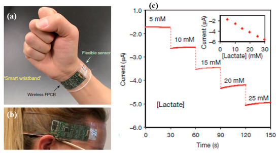 (a) Photograph of a wearable sensor array on a subject’s wrist; (b) smart headband; (c) chronoamperometric responses of lactate at different concentrations [61] (reproduced with permission).