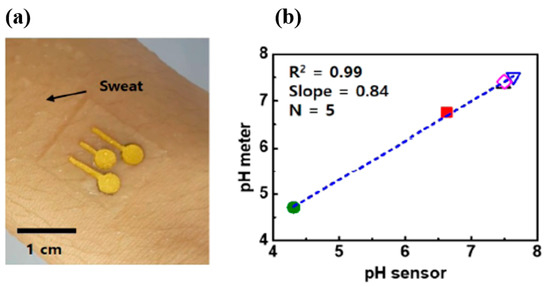 (a) Optical image of electrochemical sensor attached to the skin wet with sweat; (b) correlation of glucose concentration (left) and pH (right) measured by sensors (x-axis) with those measured by a commercial glucose assay kit and commercial pH meter (y-axis) in human sweat [9] (reproduced with permission).