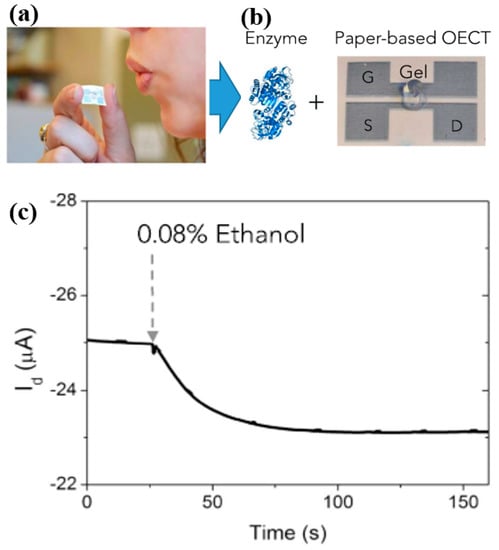 Concept of the organic electrochemical transistor (OECT) breathalyzer. (a) Simply breathing on the printed PEDOT–PSS OECT allows for alcohol detection. (b) The alcohol dehydrogenase (ADH) enzyme and the OECT are the key components of the sensor. The OECT is printed on paper, and comprises channel, source (S), drain (D), and gate (G) electrodes made of PEDOT–PSS; the enzyme electrolyte gel is deposited onto the OECT bridging the channel and gate. (c) Id response of the OECT upon exposure to ethanol [42] (reproduced with permission).