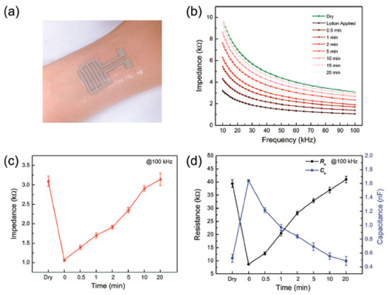 (a) Photograph showing the AgNW (silver nanowires) sensor placed on the inner side of the forearm; (b) the measured impedance change between 10 and 100 kHz from human skin before (dry) and after applying lotion; (c) comparison of skin impedance measured from AgNW sensor at 100 kHz before (dry) and after applying lotion; (d) extracted equivalent circuit model parameters (Re, Ce) before (dry) and after applying lotion [117] (reproduced with permission).