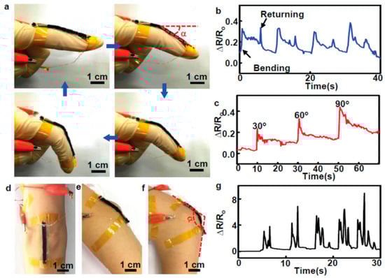 Detection of large-strain human motions with the strain sensor attached to the human finger and elbow joints. (a) Photographs showing the bending test of the finger; (b) the corresponding relative resistance change of the sensor in response to the finger bending; (c) the corresponding relative resistance change of the sensor in response to the different finger-bending angles; (d–f) photographs showing the bending test of the elbow; (g) the corresponding relative resistance change of the sensor in response to the elbow bending [137] (reproduced with permission).