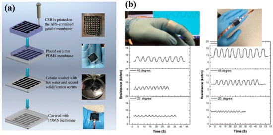 Three-dimensional (3D) printing characterization, preparation, and application. (a) Preparation of a 3D-printed wearable sensor with the CSH hydrogel. A real-time bodily motion monitoring system using smartphones and a 3D-printed CSH wearable and flexible sensor; (b) resistance variation of the CSH hydrogel strip (left) and 3D-printed sensor (right) attached onto the index finger, as the finger was subjected to repeated bending and relaxing from 0° to 20°, 45°, and 90° [155] (reproduced with permission).