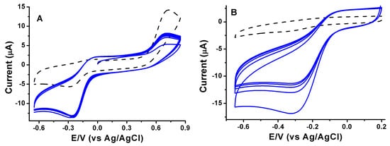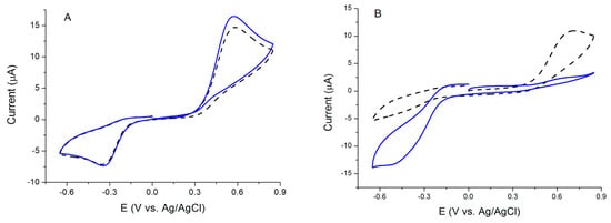 Figure 7 compares the different signals recorded when analyzing the serum of non-celiac (Figure 7A) vs. celiac patients (Figure 7B), where the dashed and full line CVs were recorded in the absence and presence of H2O2, respectively. The latter CVs indicate that a relevant catalytic current increase is observed for the celiac patient’s sample, while a significantly smaller, almost negligible effect is observed for the healthy subject’s one. Quantification of signals based on the increase in the catalytic peak current was performed by interpolation with the calibration plot reported in Figure 6.
