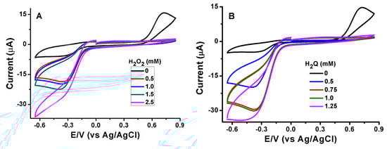 Cyclic voltammograms recorded at 50 mV s−1 with deoxygenated 0.05 M PBS (pH 7.4) containing (A) 1 mM H2Q and 0.0, 0.5, 1.0, 1.5, 2.5 mM H2O2; or (B) 1.5 mM H2O2 and 1.0, 1.5, 1.75, 2.0, 2.25 mM H2Q.