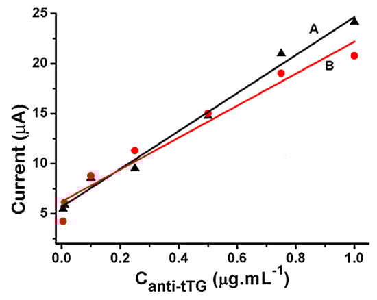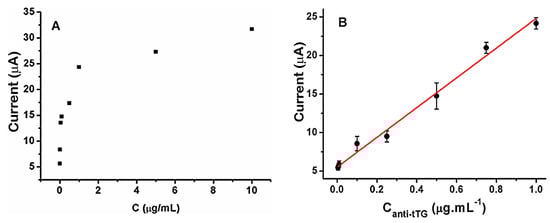 As shown in Figure 6A, the I values increase with the concentration of the anti-tTG (Canti-tTG), tending to an asymptotic profile for concentrations greater than 1 µg mL−1; however, a linear trend (R2 = 0.990) can be identified for concentrations of ≤1.0 µg mL−1 (see Figure 5B).