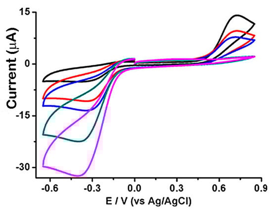 The dependence of the detected catalytic peak current signal at the immunosensor on the anti-tTG concentration was studied over a wide antibody concentration range (0.001 to 10 µg mL−1). The experiments were performed in triplicate by incubating different TGNEEs with serial dilutions of monoclonal standard mouse anti-tTG. The CV responses of four representative concentrations are reported in Figure 5.