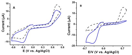 Cyclic voltammetric responses of serum samples recorded at 50 mV s−1 with the proposed immunosensor in 0.05 M PBS (pH 7.4) containing freshly prepared 1 mM H2Q before (dashed lines) and after (solid lines) addition of 1.5 mM H2O2: (A) serum sample from healthy subject (sample 10691), (B) serum sample from celiac patient (sample 10636).
