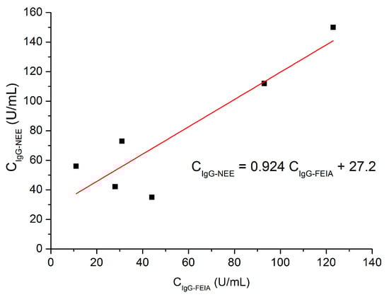 Correlation plot between anti-tTG IgG activities measured by the electrochemical immunosensor (CIgG-NEE) vs. FEIA analysis (CIgG-FEIA) in human serum samples.