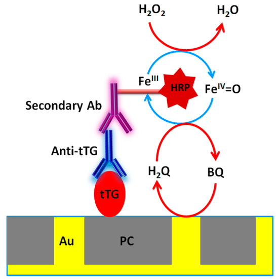 Scheme depicting the immunosensor architecture and the associated electrochemical and enzymatic processes, where PC= polycarbonate; tTG = tissue transglutaminase; Anti-tTG = antibody for tissue transglutaminase; HRP = horseradish peroxidase; H2Q = hydroquinone; BQ = benzoquinone. Components are not drawn to scale; the average diameter of the Au nanoelectrodes is 30 nm and their average center-to-center distance is 200 nm.