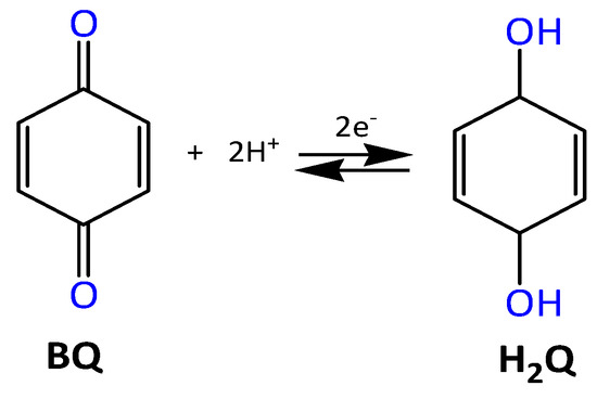 Electrochemical reduction of benzoquinone (BQ) to hydroquinone (H2Q).