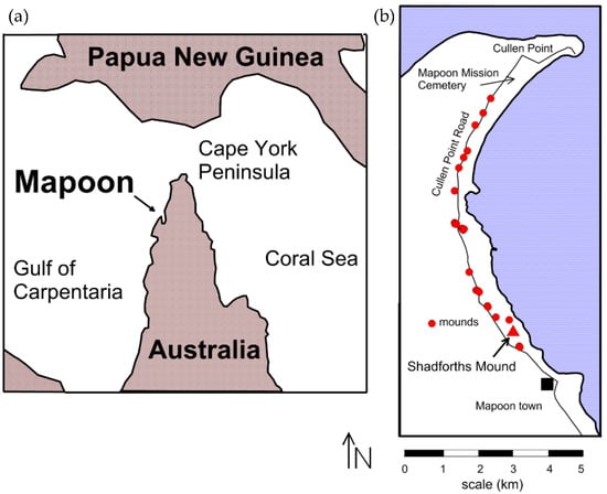 Base map of the Mapoon area, northern Australia, where a number of mounds have been found that are the basis for this study. (a) Mapoon location in northeast Australia (b) Mound locations near Mapoon.