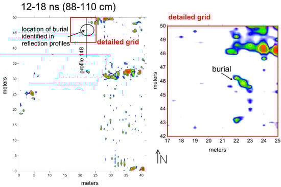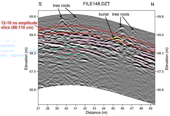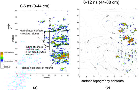 This “immediate gratification” method of GPR data visualization is one that most of us now commonly use when starting our interpretation. Here, we suggest that there is important information available within the data that needs to be taken into consideration to provide a more comprehensive and varied analysis of GPR. Elsewhere, the case has been made that there are a variety of data forms that can also provide important information from the ground, which are being overlooked in modern interpretative approaches [,,]. Those include an analysis of individual reflection traces, reflection profile analysis, and data processing specific to individual site parameters. Depending on the questions to be asked, a variety of data analyses should be undertaken while still using the standard amplitude slice-maps as a basis from which to begin.