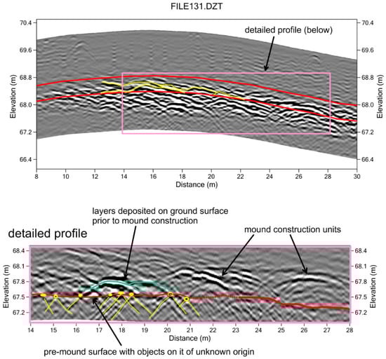 Only after frequency filtering the raw radar waves and then producing a detailed profile of only the stratigraphy of interest can the origins of the pre-mound units be determined. In this area of the Shadforth’s Mounds, it is apparent that objects of some sort were first placed on the ground surface, and covered by intentionally mounded units to create elevated areas for some reason. Perhaps they were areas for people to keep dry during the rainy season [] or had some other function that cannot be determined without excavations. Later, this area was transformed into a mound, the remains of which we see today, which was used for the burial of human remains.