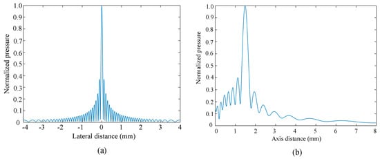 Using Equation (3), the number of linear array elements is 72, the array element width is 50 μm, the array element height is 0.5 mm, the center frequency is 10 MHz, the array element center spacing is 70 μm, and the sound velocity is 1.5 mm/μs. The focus position is F(0, 0, 1.5 mm). The lateral sound field and axis sound field distribution are shown in Figure 2. The longitudinal sound field reaches its maximum at the focus, as shown in Figure 2b. For the lateral sound field, the main lobe, side lobe, and grating lobe are the main factors affecting it. An unsatisfactory sound field can cause resolution artifacts, grating-valve effect artifacts, and side-lobe effect artifacts in ultrasound imaging [19]. Next, we discuss the influence of array element parameters on the lateral sound field.