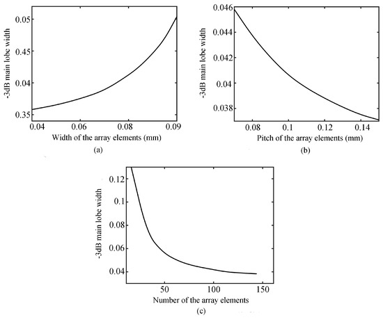 Relationship curve of array width (a), pitch (b), and number (c) with the transverse sound field of the −3 dB main lobe width.