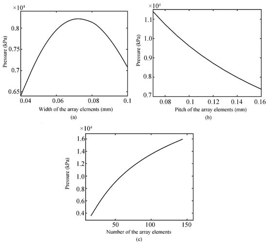 When the focus position is F(0, 0, 1.5 mm), the pitch is 160 μm, and the number of array elements is 72, Figure 5a shows that the intensity of sound pressure increases first and then decreases with the increase of array element width when the operating frequency is 15MHz. When the operating frequency is 15 MHz, the focus position is F(0, 0, 1.5 mm), the width is 50 μm, and number of array elements is 72, the intensity of sound pressure tends to increase as the pitch of elements decreases, as shown in Figure 5b. When the operating frequency is 15 MHz, the focus position is F(0, 0, 1.5 mm), the width is 50 μm, and the pitch of array elements is 70 μm, the intensity of sound pressure tends to increase as the number of elements increases, as seen in Figure 5c. In general, as the width of the element is increased within a certain range, it can increase the intensity of the sound pressure; the specific range is affected by the number and pitch of the array elements, which need to be analyzed on a case-by-case basis. However, although this method can increase the intensity of sound pressure, it is not conducive to the main lobe. Reducing the width of the array element can increase the intensity of the sound pressure, but this method is not only limited by the fabrication process of piezoelectric ceramic wafers and the production cost of transducers, but also increases the width of the −3 dB main lobe and reduces the transverse resolution. Increasing the number of array elements can obtain a higher sound pressure intensity, but it will also lead to a larger overall size of the transducer and increased production costs, and it is not conducive to the detection of micro-scale features. Therefore, the preparation of the transducer still needs to consider the balance of each parameter and the actual operation to find the optimal design scheme.