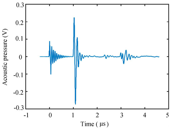Transverse sound field test experiments were conducted with the microscale transducer immersed in water. Figure 10 is a diagram of the setup for pressure measurements in water. The micro-transducer was fixed to the fixture, then a needle hydrophone with 1 mm effective diameter was fixed to a three-dimensional positioning device, which was controlled by a motor, and had a moving accuracy of up to one micron. The micro-transducer was driven with pulses of 100 V, 50 ns pulse width, and 1000 Hz in a sequence according to a certain delay law by using a Phascan portable ultrasonic phased-array detector. The selected phase delay of each column was calculated based on the acoustic propagation path length from each array element to the desired focal point. Figure 11 shows the hydrophone measured sound pressure curve at the focus point when the number of linear phased-array elements was 32, the width of the array element was 50 μm, the pitch of array element was 70 μm, the height of array element was 3 mm, the sound velocity was 1500 m/s, and the focus position was (0, 0, 1.5 mm). The value of peak-to-peak (Vpp) of the curve is regarded as the sound pressure at the focus point.