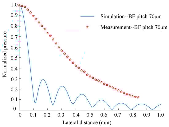 The imaging resolution of a microscale transducer is closely related to the main lobe width in a transverse sound field distribution. The narrower the main lobe width is, the higher is the imaging resolution is. In this paper, −3 dB main lobe width is taken as the reference, and a −3 dB main lobe width is the distance between two points of the corresponding transverse distance axis when the normalized sound pressure is −3 dB. If the main lobe is not ideal, resolution artifacts are likely to occur. Due to the limitation of the spatial resolution of the system, any object with a distance less than the resolution of two or more points can only be displayed as a larger object in the image, which is often referred to as low horizontal or vertical resolution [19].