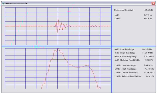 First, an pules-echo test was performed on a single array element, and Fourier transform was performed for the convenience of analysis, as shown in Figure 13. As can be seen from the frequency domain, the bandwidth was narrow. We believe that the pressure-welded wire needs to be filled with pure glue to protect it instead of directly filling the matching layer, so the waveform was not ideal, and we can improve it in later experiments.