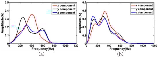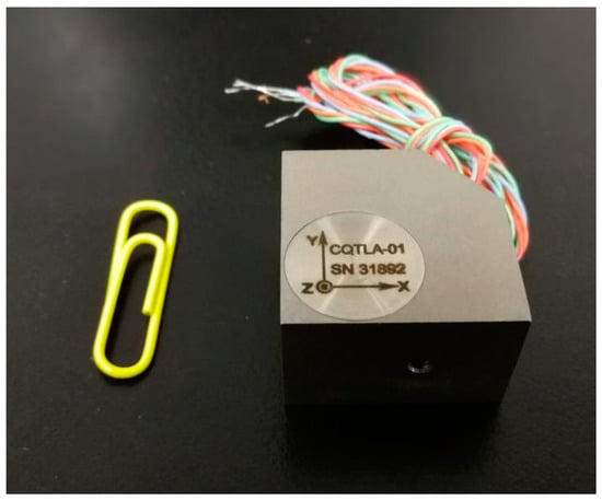 Two main types of sensors are commonly used in seismic geophones: the coil-based sensor and the piezoelectric sensor [,]. Coil-based sensors are rugged, cheap, and self-powered []; however, they have a narrow bandwidth spectrum and low sensitivity. In tunnel seismic exploration, the offset is normally small, so the signal spectrum can be up to 2 KHz. Coil-based sensors do not meet the requirements of tunnel seismic exploration. Tunnel seismic data include strong amplitudes of direct waves, acoustic waves, surface waves, and tunnel face reflections, whereas the reflected waves from the geological body of the advanced tunnel face are relatively weak. Coil-based sensors are unsuitable for capturing weak signals like these; therefore, a three-component piezoelectric sensor was selected (Figure 1) to ensure that the geophone had a spectrum range of 10 to 5000 Hz and a sensitivity of 2.8 V/g. These sensor parameters satisfy the requirements for tunnel seismic detection. The specifications of the three-component piezoelectric sensor are shown in Table 1, where x y and z represent the X-component, the Y-component, and the Z-component, respectively. The amplitude responses are shown in Figure 2. The sensor was tested using two vibration platforms: Figure 2a shows the low-frequency signals and Figure 2b shows the medium- and high-frequency signals.