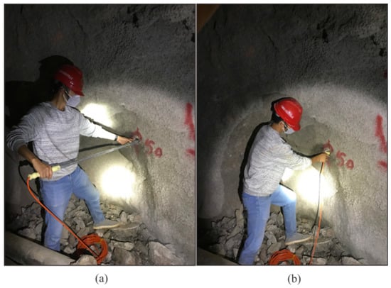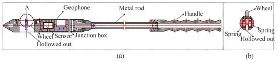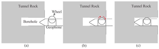 To guarantee the high quality of the seismic data, our method still requires drilling a 2-m-deep hole to install the geophones. The design of the semi-automatic coupling geophone is shown in Figure 3. Figure 3a presents a side view where the device consists of three parts: the geophone, a metal rod, and a handle, from left to right. The geophone is composed of a piezoelectric sensor, a wheel, and a junction box. The wheel is used for coupling. Figure 3b provides a cross-section view of wheel. The center of the wheel is connected with two hard springs so that the wheels can rotate and move in the vertical direction. Once the device has been pushed into the borehole, the wheel starts to roll along the surface of the sidewall of the borehole, which facilitates the installation of the geophone. In addition, its tight coupling and easy removal are ensured. The process of installing the semi-automatic coupling geophone is shown in Figure 4. After the whole device has been pushed into the borehole, a wedge-shaped stone block is applied to clamp the tail of the device to prevent the vibration of the tail at the end of the rod. Afterward, the hole is sealed with clay to reduce the sound waves. However, the rolling approach creates new problems as considerable amounts of rock slag remain in the tunnel borehole and the rolling process will force the slag into the cavity below the wheel, which will eventually block the wheel. Therefore, the sleeve under the wheel was designed to be hollowed out, as shown in Figure 2. The wheel was directly washed after each use, so that the slag could be directly discharged from the hollow cavity below the wheel.