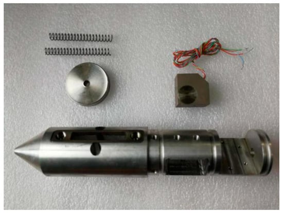 The theory of tunnel seismology is mainly based on oil seismology. The processing flow resembles the Vertical Seismic Profile (VSP) method [,]; however, the coupling of the geophone differs from oil seismology to some degree. In oil seismology, the tails of the geophone are buried vertically into the surface soil to achieve better coupling []. As a tunnel essentially consists of hard rocks, the coupling is difficult. At present, three main coupling methods are used in the industry. The first method is the casting method []. To perform this method, first, a 2-m-deep hole is drilled into the tunnel wall and an anchoring agent is pushed into the hole with a push rod before a special-made steel pipe is pushed into the borehole. The length of the steel pipe is 2 m and the cross-section is a square with a side length of about 3 cm. Second, the steel pipe is struck with a heavy hammer to fully insert the front end of the steel pipe into the anchoring agent inside the drill hole, before waiting for the anchoring agent to solidify. At this time, the steel pipe is firmly bonded into the tunnel wall, and the geophone is pushed with a special-made push rod. The steel pipes are designed to fit geophones, so the size of the geophone is slightly smaller than the size of the steel pipes. Taking geophones out for reuse is convenient for workers with this user-friendly design. This method significantly reduces acoustic and surface waves and the influence of low speed circle that are caused by excavation. This method has the following shortcomings. First, as the geophone can be pushed in and out freely in the steel pipe, the coupling is not sufficiently tight; second, this method is time-consuming and requires about half an hour to install one geophone; finally, it is expensive. Once the steel pipe has been tightly bonded to the tunnel wall, it cannot be taken out for reuse. The cost of each data acquisition in steel pipes and anchoring agents is about $700 dollars. The second method is the clay coupling method, which is widely used in China []. With this method, a 2-m-deep hole in the tunnel wall is first drilled and clay is placed into the borehole before the geophone is pushed into the clay. The clay fills the gaps between the geophone and borehole to ensure good coupling. This method is cheaper, but is unable to address the other two issues of the casting method. The third method is the direct coupling method, wherein the geophone is directly attached to the tunnel wall with quick-drying cement []. However, this method acquires a large amount of noise, such as acoustic waves and surface waves, and also fails to avoid the influence of the tunnel surface low speed circle caused by excavation. To address these coupling issues, we designed a wide-band and high-sensitivity semi-automatic coupling geophone.