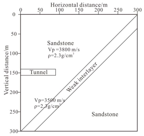 The model mainly consisted of sandstone, but with a sloping weak inter-layer in the middle. The weak inter-layer had a length of 60 m in front of the tunnel face and the thickness was 25 m. In Figure 7, Vp is the primary wave velocity and ρ is the density.