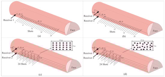 The four geometries used in this study, where the minimum offset was 30 m, the borehole span was 2 m, and the spacing for the vertical geophones was 9 m: (a) 24 shots and 1 geophone, shots were arranged along a straight line; (b) 2 geophones were placed at the top and bottom of the tunnel wall. The vertical location of shot line was 4.5 m. Compared with the first geometry, the second geometry had an additional geophone and vertical offset. (c) The shots were arranged in a 2D 15 m × 9 m plane. The red pots are the shot locations. The locations of two geophones were the same as the second geometry. Compared with the second geometry, this geometry has a shorter horizontal offset and more vertical offset. (d) The ventilating pipe, water pipe, and machines obstruct the desired layout of the third grid geometry in the environment of the tunnel construction. Thus, the 24 shots were randomly positioned in the 2D plane. Compared with the third regular geometry, the fourth geometry design layout is more likely to be used in complex tunnel environments.