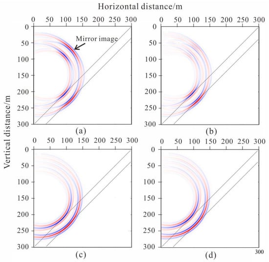 The geometry could clearly image the weak inter-layer; however, mirror imaging occurred in the migration profile (Figure 9a) and the amplitude of the mirror imaging was the same as the image of the weak inter-layer. Compared with the migration imaging of the first tunnel seismic geometry (Figure 9a), the mirror imaging of the second tunnel seismic geometry was diminished (Figure 9b). The mirror imaging of the third tunnel seismic geometry was weaker than in the second, although this migration imaging obviously prolonged the length arc in the third geometry than in the previous two (Figure 9c). The migration profiles of the fourth geometry were almost the same as the third geometry (Figure 9d). The mirror imaging of the last two geometries were greatly suppressed, although the arc was obvious. In the construction of tunnel engineering, the harm caused by mirror imaging is much greater than that of the arc because the arc only reduces the resolution, whereas the mirror image is wrong and not the true reflection of the geological body. Therefore, the geometries we propose are more reasonable and can be used in practical applications.