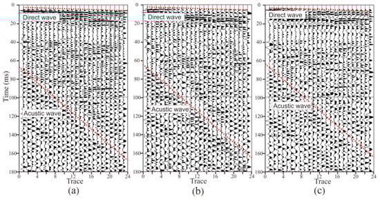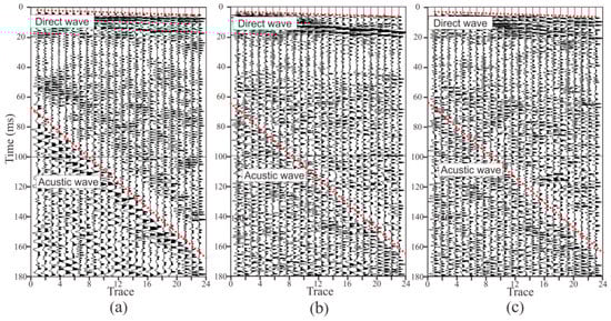 Figure 11 and Figure 12 present the seismic data obtained by two semi-automatic coupling geophones. The x-, y-, and z-component data are similar, indicating that the consistency of the three-component sensors was good. The seismic signal in the tunnel is more complicated than the oil seismic signal. As the oil seismic wave propagates in half space, and the velocity of the medium is faster from shallow to deep, the seismic wave is continuously refracted during the propagation. When the depth of detection is several kilometers, the seismic wave is assumed to be normally incident and reflected, and the propagation path of the seismic signal is relatively simple. In tunnel seismology, since the detection distance is within 200 m, the seismic wave is a spherical wave that propagates in the whole space. Therefore, the seismic wave propagation path is complicated and can be transmitted from almost any direction of the whole space. The seismic signals in Figure 11 and Figure 12 mainly include direct waves, surface waves, the reflected wave of the face, acoustic waves, the reflected wave of the geological body in all directions of the tunnel, and various noise signals in the tunnel. These seismic waves overlap most of the others, so only the direct wave and the acoustic waves (red dashed lines) can be found in Figure 11 and Figure 12. The upper red dotted line in Figure 11 and Figure 12 represents the direct wave. Converting the abscissa in the figure into the offset, the reciprocal of the slope of the line is the velocity of the direct wave. The velocity of the direct wave is an important parameter for understanding the geological conditions of the rock, and is also an important parameter for subsequent data processing. The direct wave was clear and presented as a distinct line, indicating that the quality of the acquired data was high. The red dotted line in the lower part of Figure 11 and Figure 12 is the acoustic wave. As the explosive was excited in the rock and the tunnel space was narrow, the acoustic wave energy was strong, so it was be clearly identified, as shown in Figure 11 and Figure 12. Converting the abscissa in the figure into the offset, the reciprocal of the slope of the line was the velocity of the acoustic wave. The sound wave was removed as a noise signal during processing. However, since the velocity of the acoustic wave was stable, the data could be used to verify whether the measurement of the field geometry was accurate.